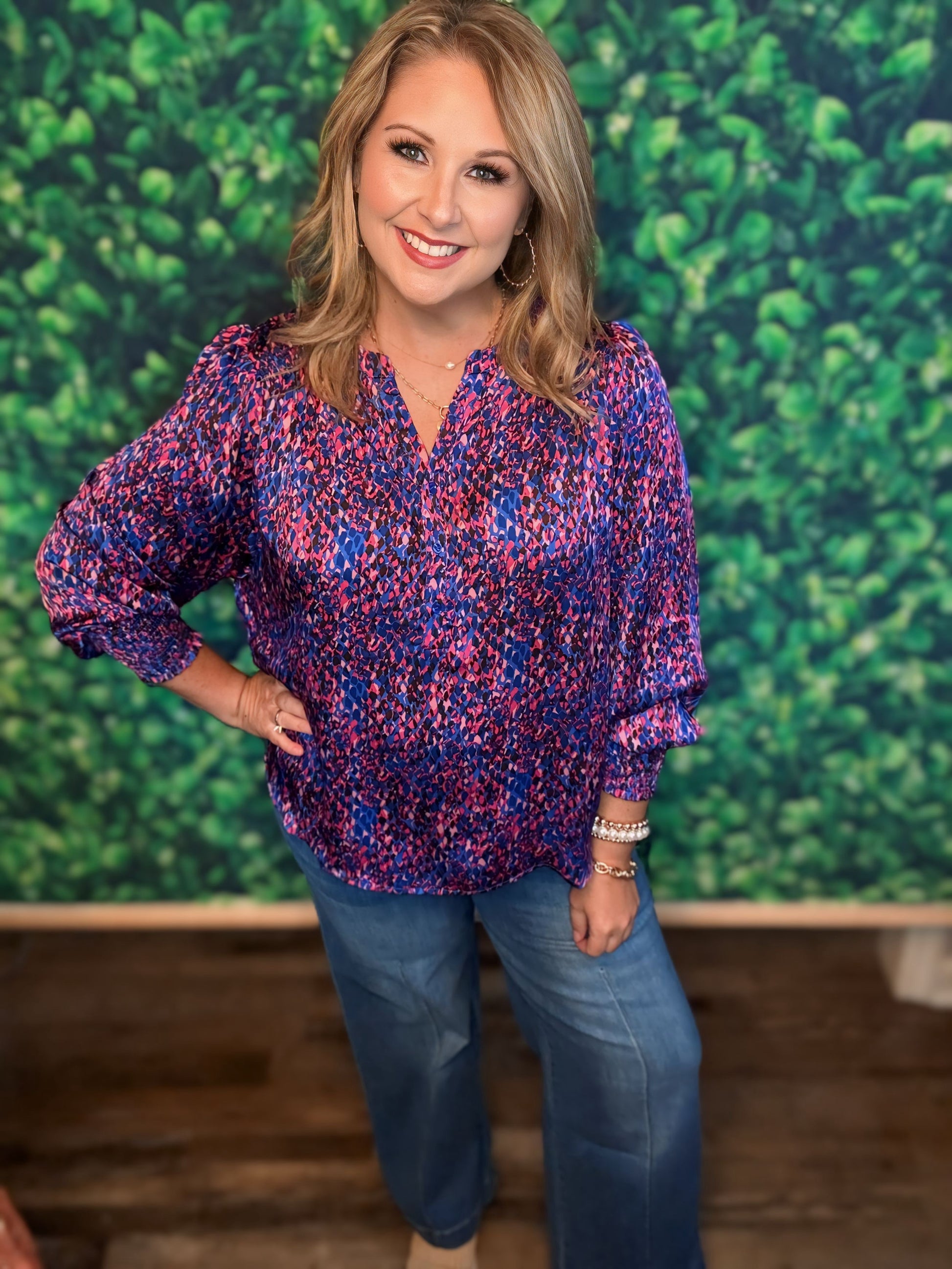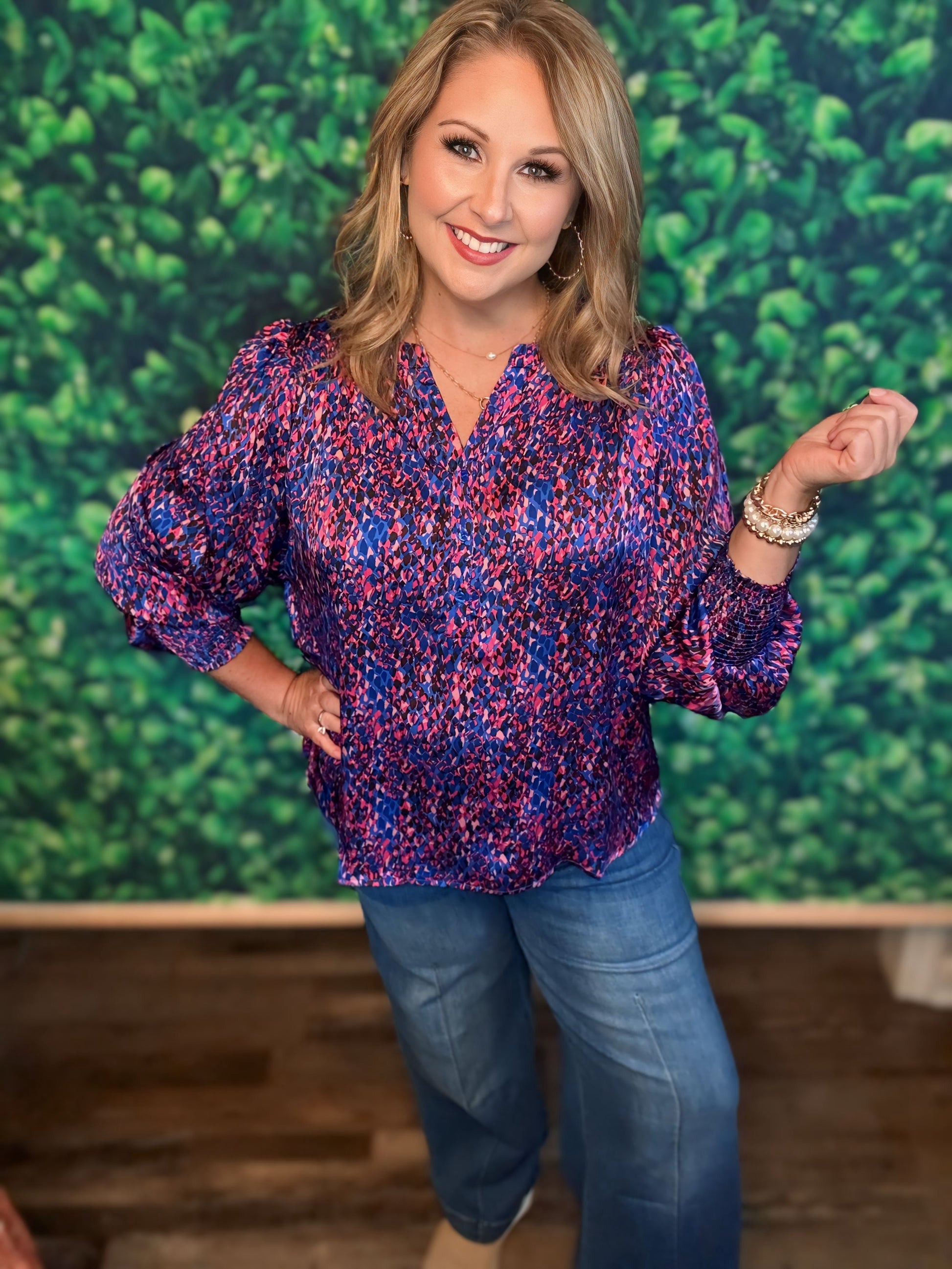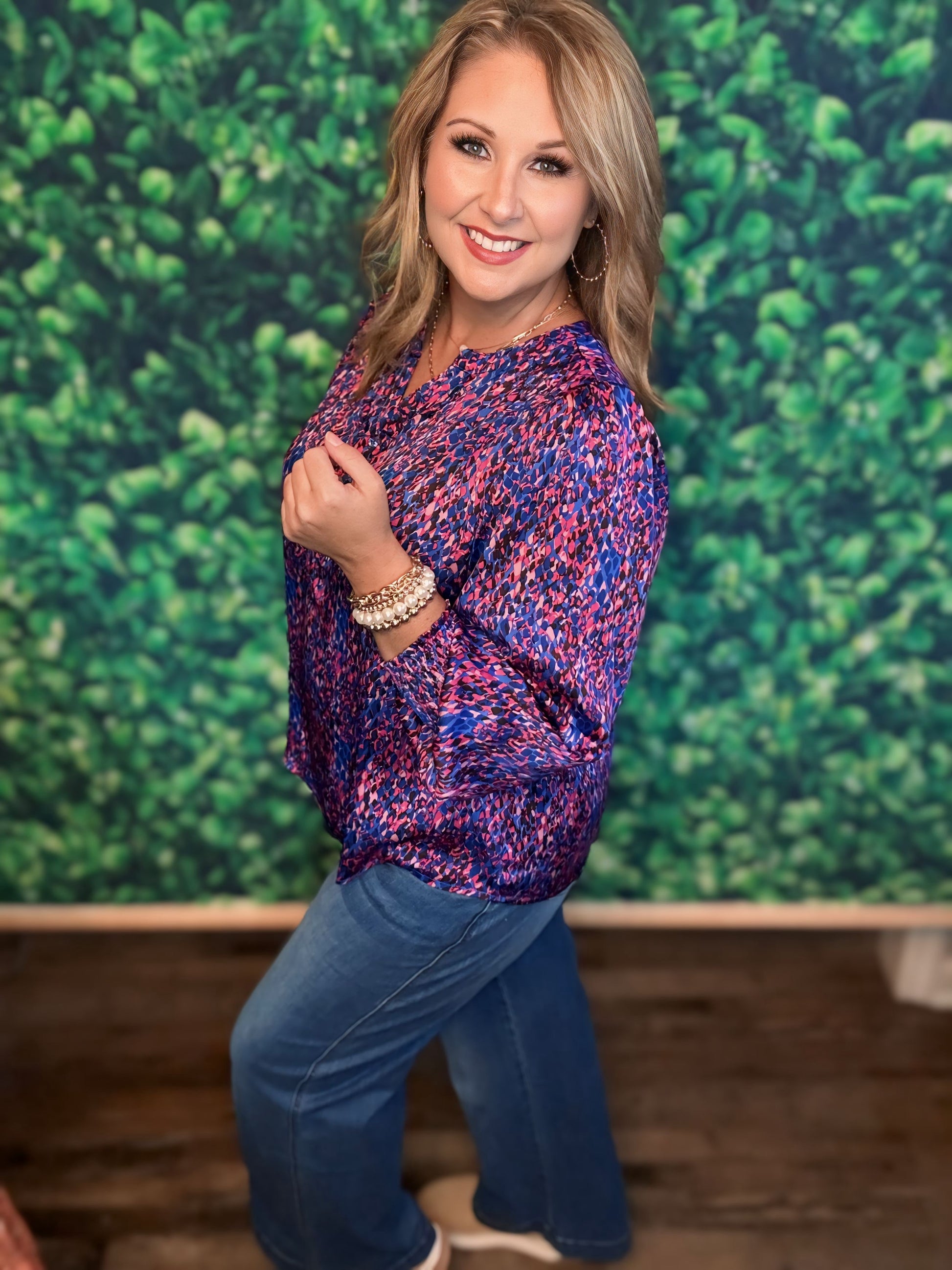 ABSTRACT PRINTED SATIN BLOUSE IN BLUE