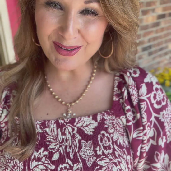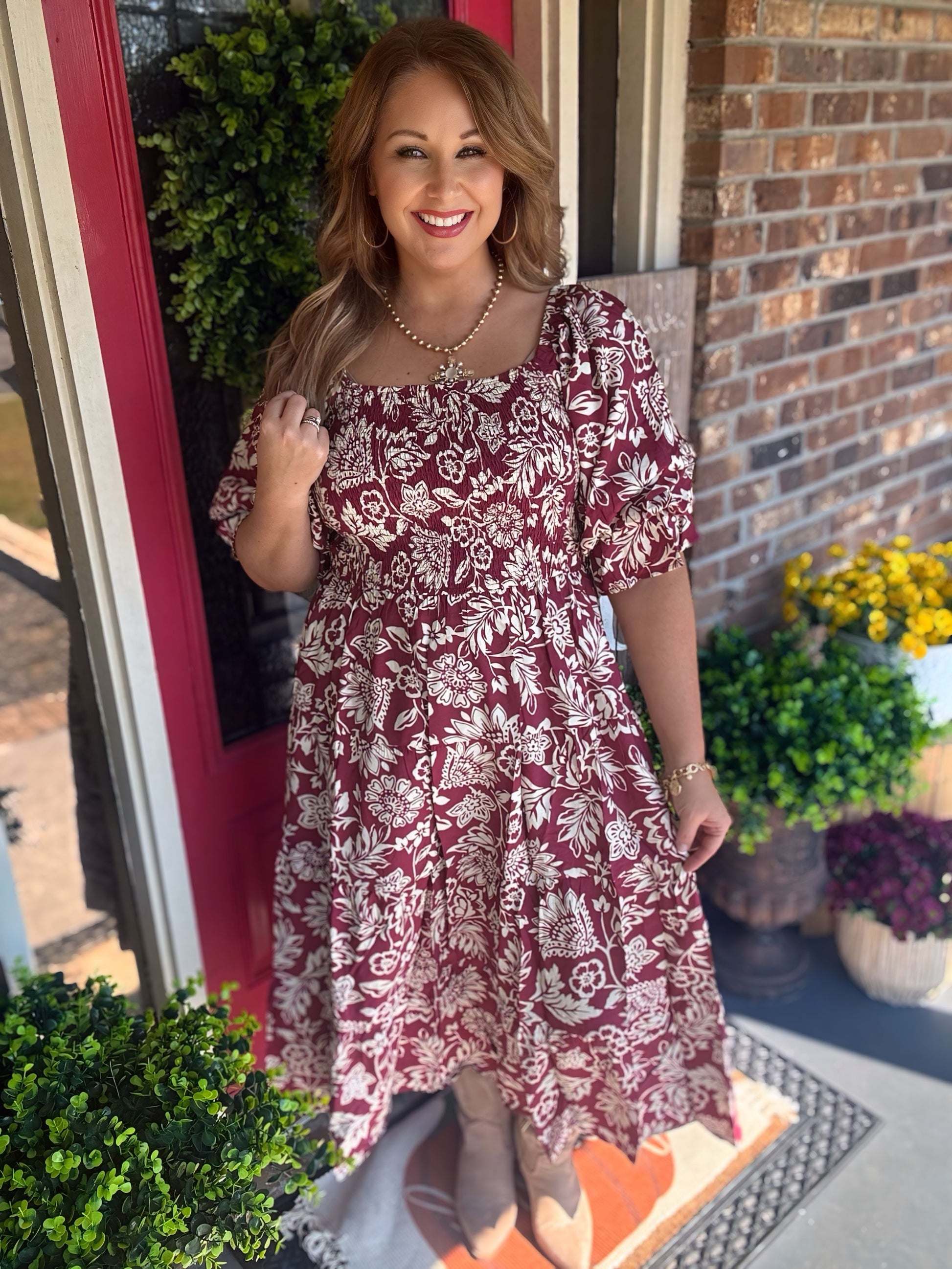Flaunt your unique style with the Cristina Midi Dress. This burgundy dress features a beautiful ivory floral print, smocked bodice, puff sleeves, and a square neckline for a flattering fit and features pockets for Convenience. Perfect for any occasion, this dress will keep you comfortable and chic all day long!