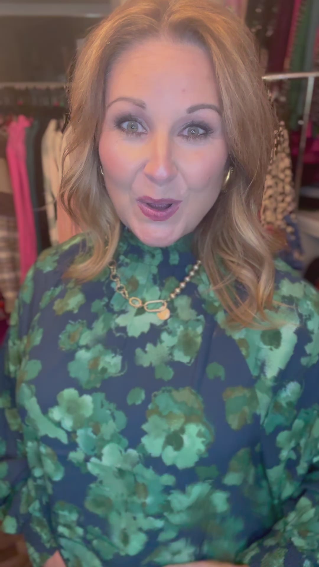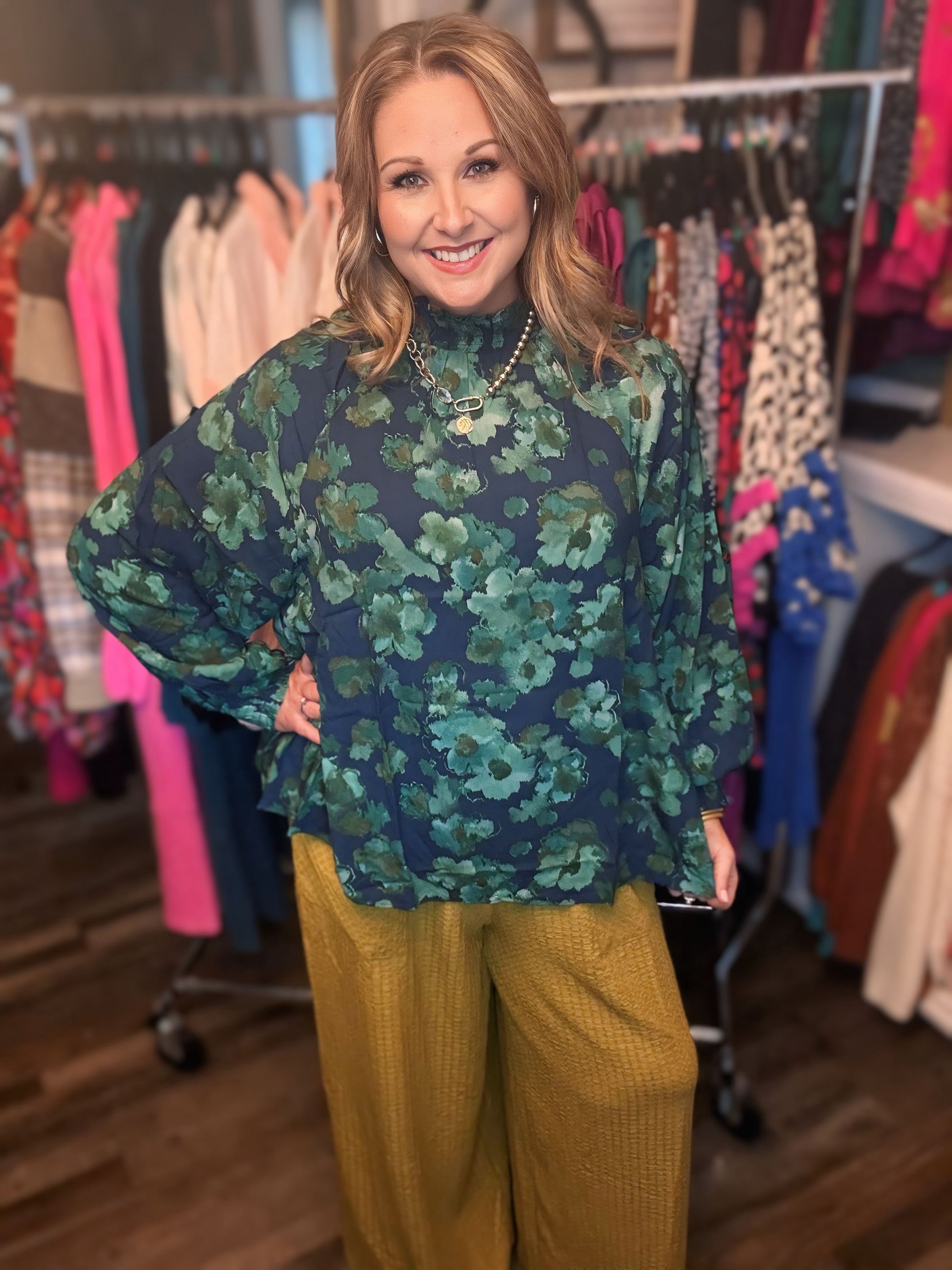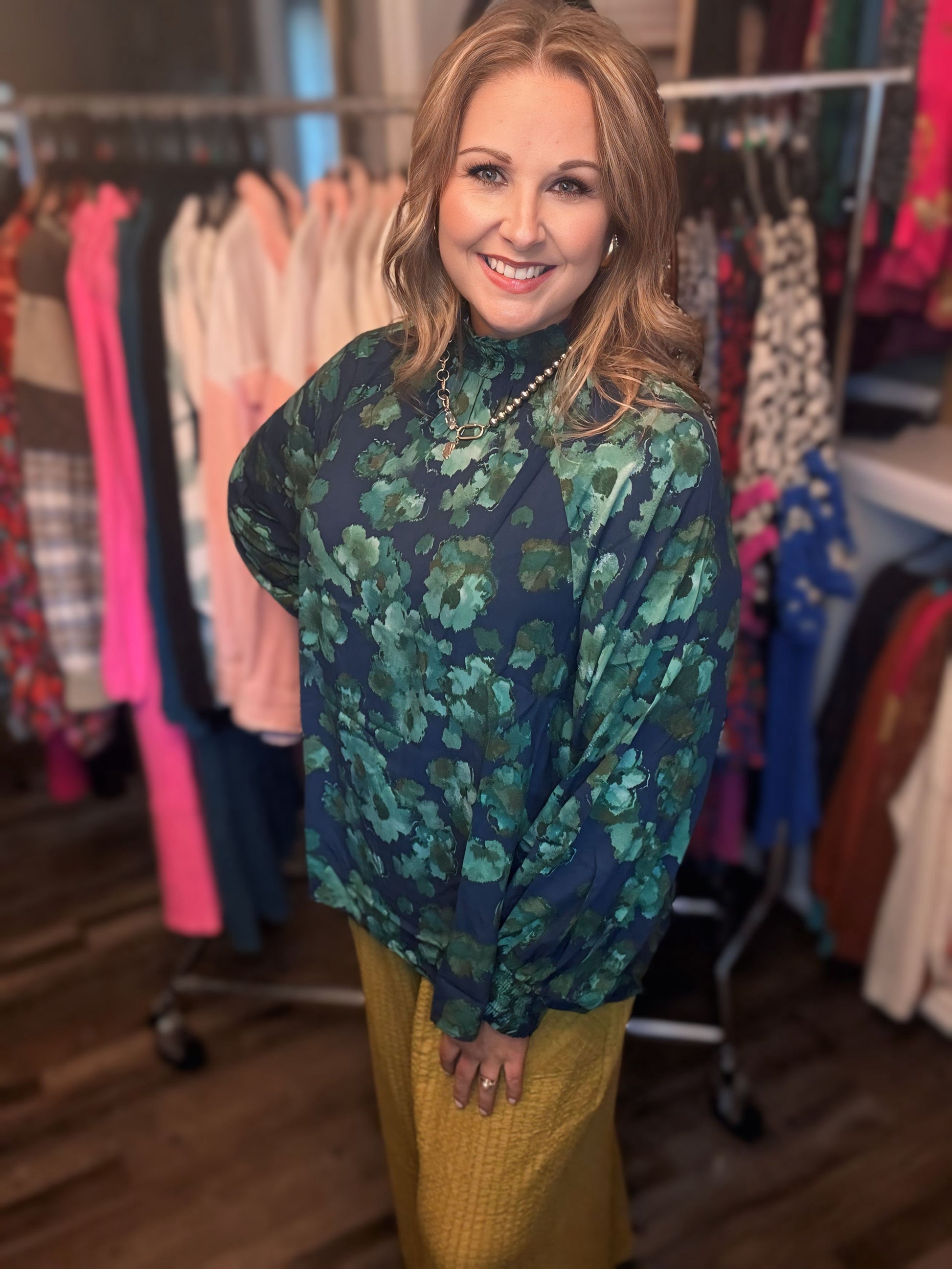 EMERALD FLORAL PRINT MIRABELLE MOCK NECK WOVEN BLOUSE
