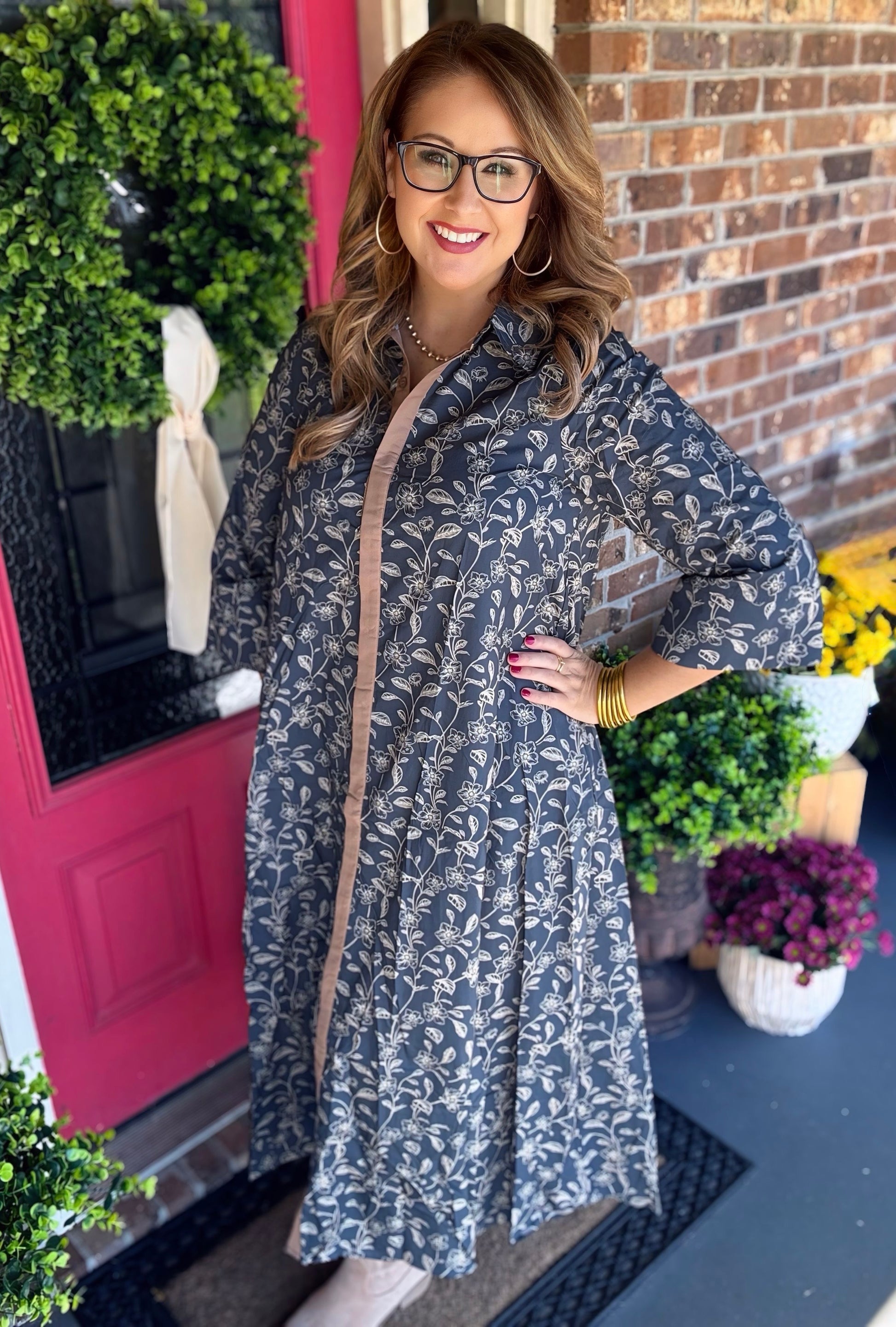 Floral print 3/4 sleeve Midi dress featuring hidden button closure at front. Shirt collar. Side pockets. Unlined. Woven. Non-sheer. Lightweight.