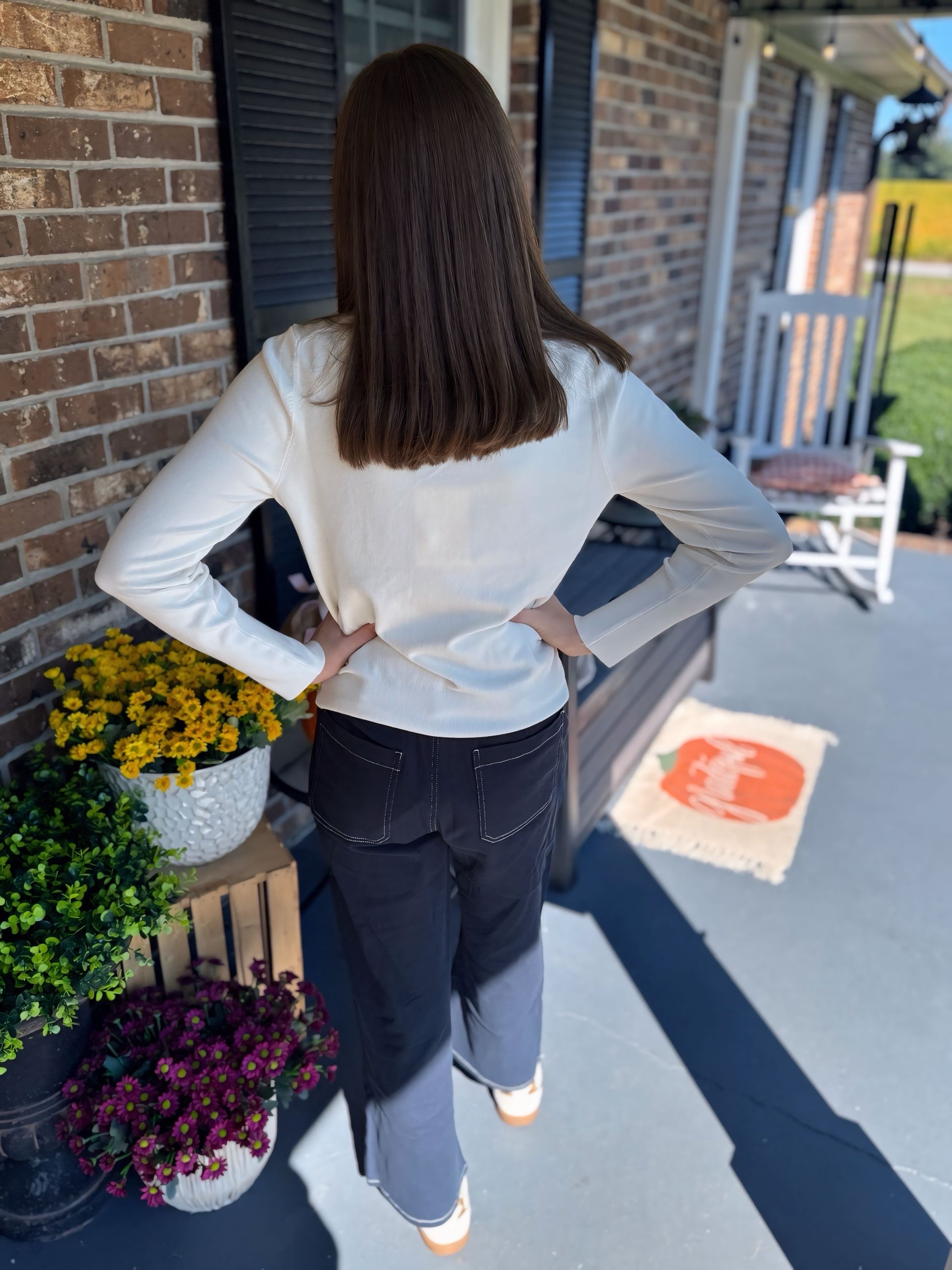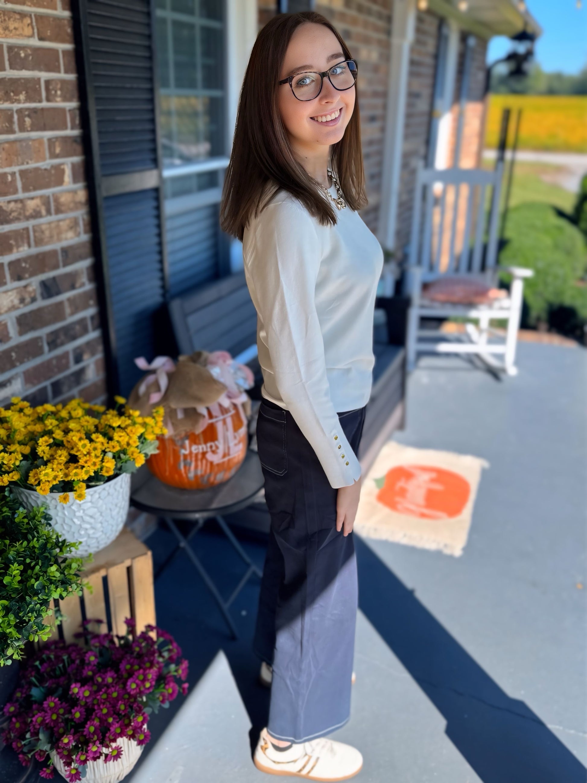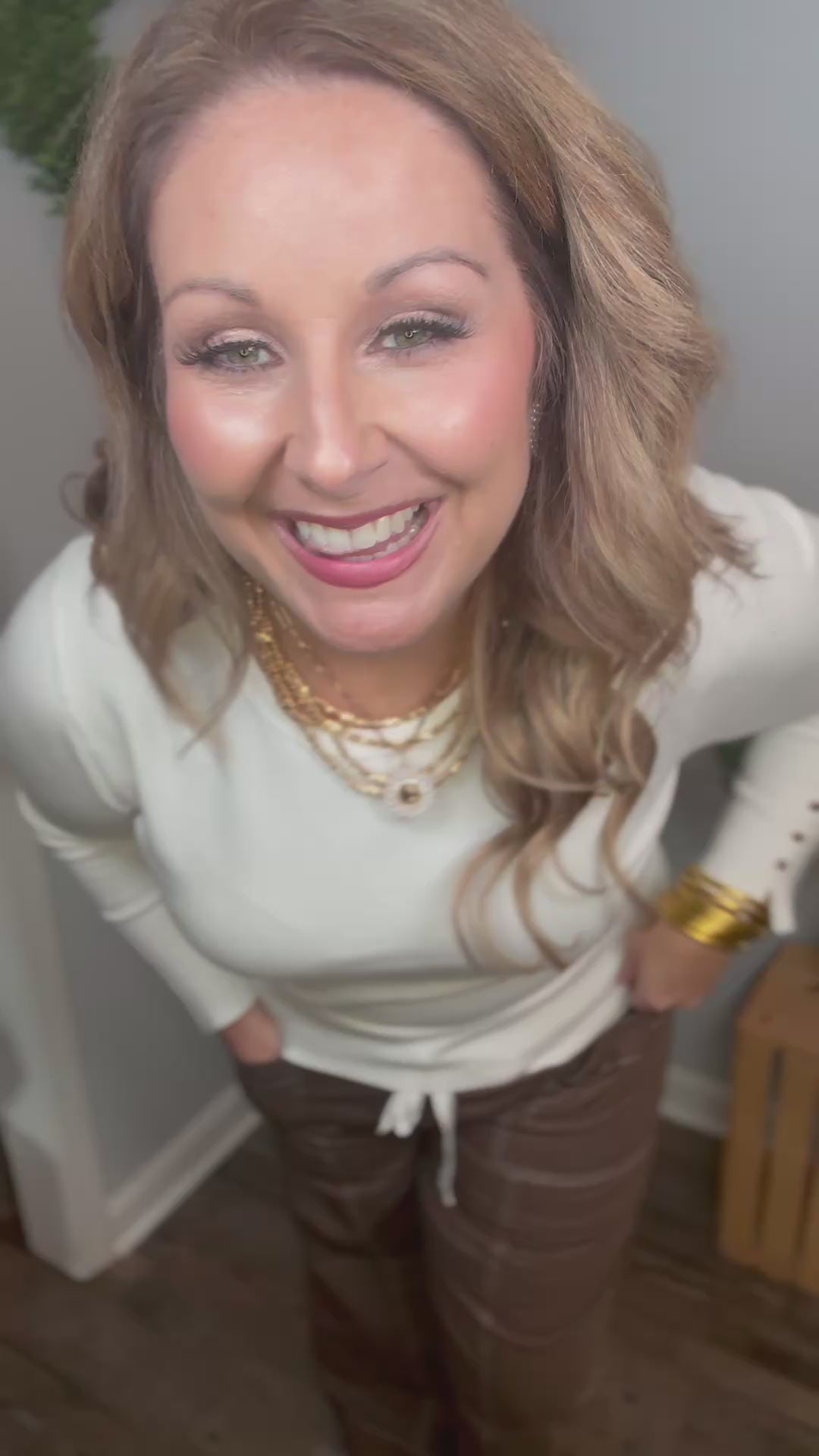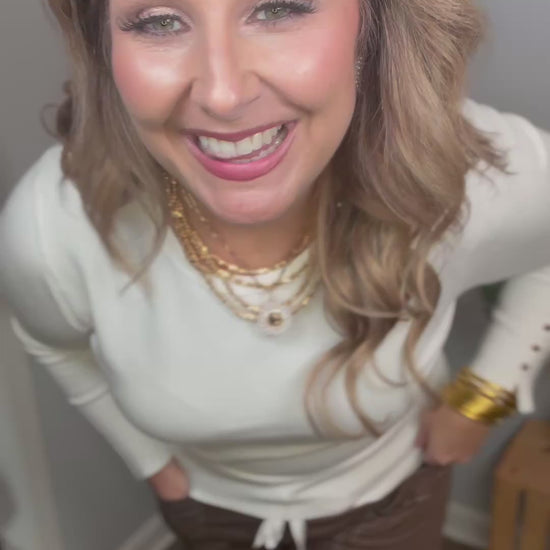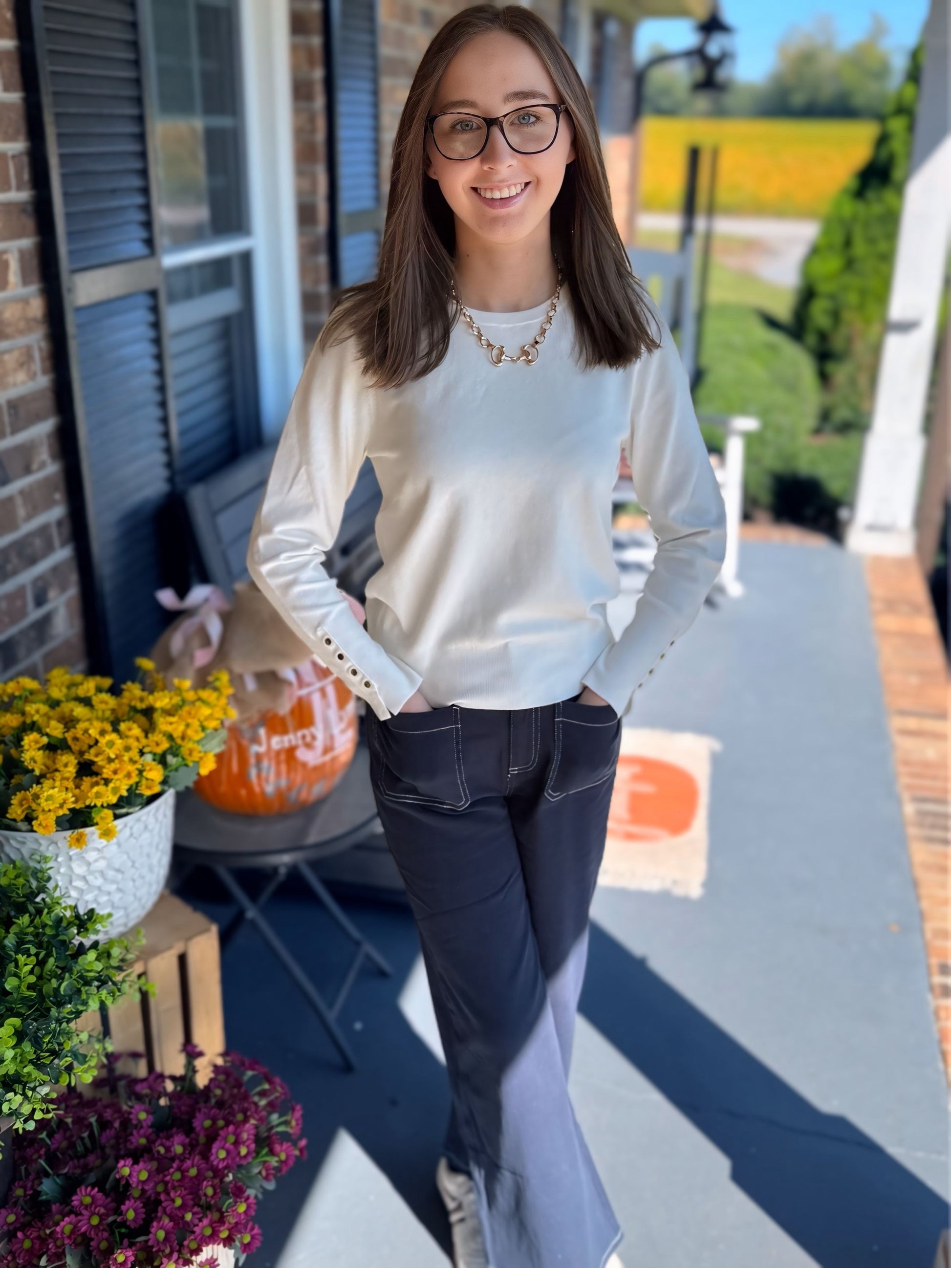 Solid round neck long sleeve top featuring button detail at cuffs. Unlined. Knit. Non-sheer. Lightweight.